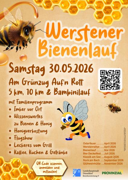 Genießt unsere Bienenheimat Wersten und freut euch auf ein tolles kleines Familienprogramm rund um die Wild und Honigbiene.,Honig Verkostung inklusive. Ratet mit, wer ist schneller die Biene, oder die Läufer:innen??